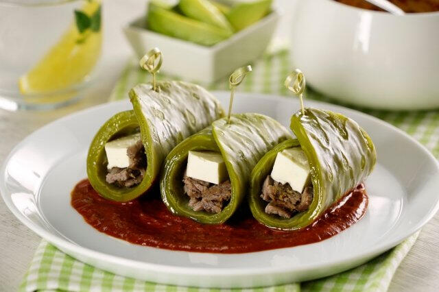 Cactus pads are rolled around meat and cheese, and steamed under a grill. Served with a savoury, spicy sauce on the side for dipping.