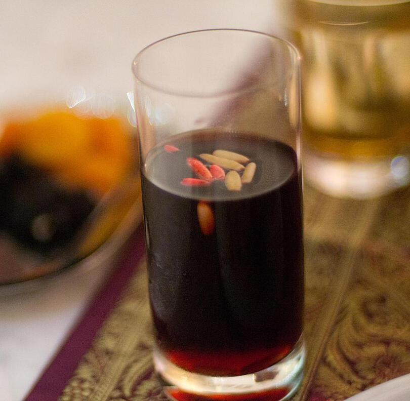 Grape juice, date juice, and rose water are accented with pine nuts for a refreshment that's as tart as it is sweet and savoury.