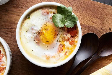 Poached egg rests atop a bed of spicy tomato, seasonal squash, and sweet roasted onions. Comes served in a ramekin.