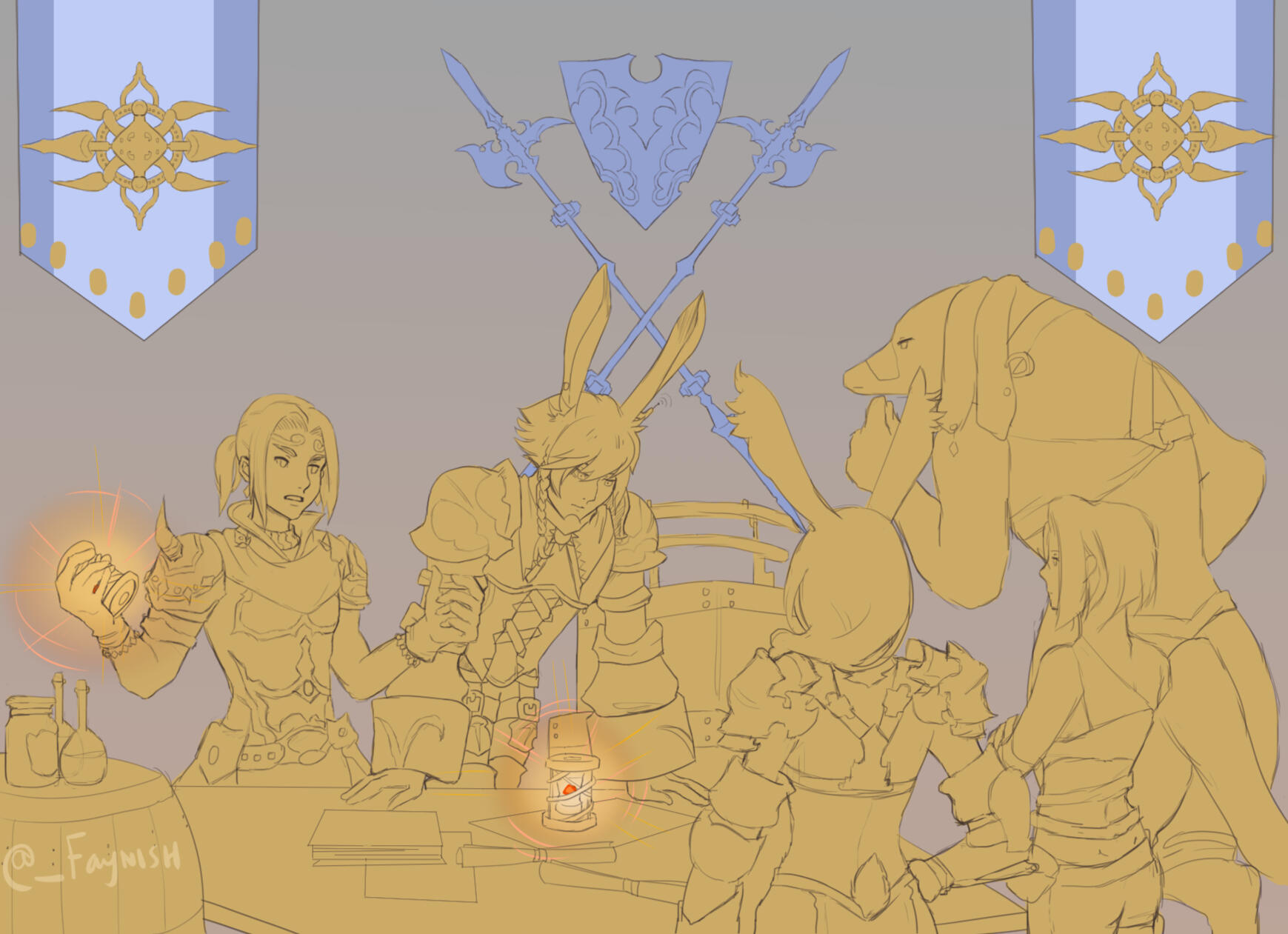 OOC: While the Brewery was once merely a dedicated corner of Tumelo's Sundries, this downstairs tavern offers a front to the Dalmascan Resistance. Behind the bar and hidden behind the WC resides a back room where the Sun Crest Resistance Unit once held their meetings. While the unit is currently scattered in their attempts to recruit the Warrior of Light, foreign nations, and other rebel units into an alliance, Tumelo still keeps the place tidied and ready for their eventual return. Other Resistance factions may make use of the room; see our rules for more information.Aside from the hidden, soundproofed back room, there is also Huntmaster Lohen and his hunting billboard near the stairs. You can read more about these hunts here to earn Sun Crest seals.